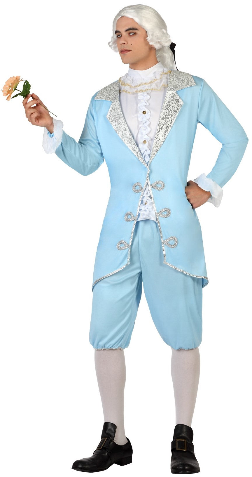 Ce déguisement se compose d'une redingote en tricot bleu avec biais argenté et revers en dentelle. Une chemise à volants avec col en dentelle. Un pantalon en tricot avec biais argenté.