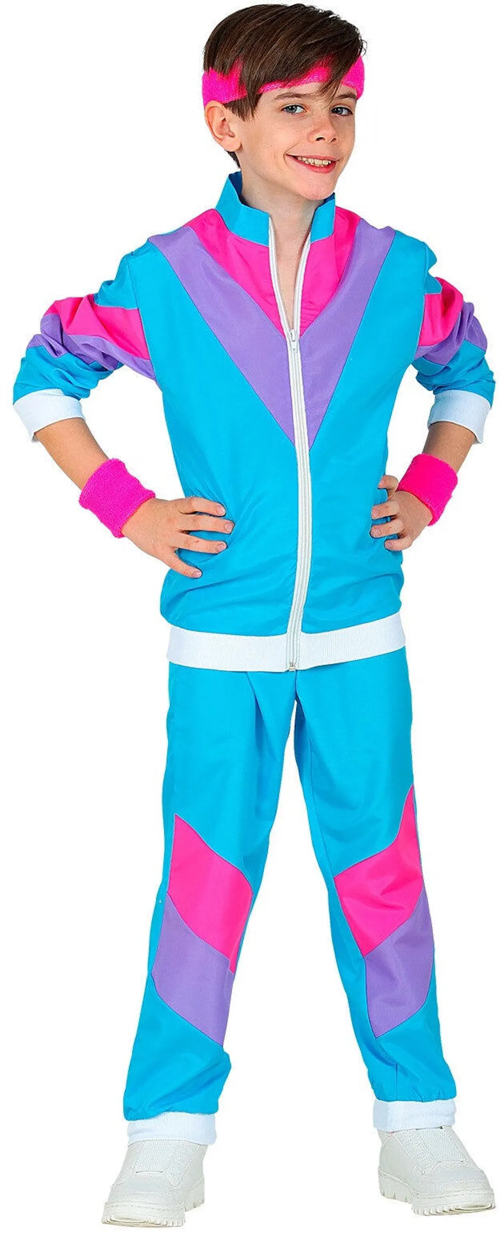 Vous cherchez le déguisement rétro parfait pour le petit bout de chou de votre famille ? Ce survêtement en tactel des années 80 pour garçon ou fille, décliné en bleu, rose et violet, leur permettra de se démarquer avec authenticité lors de leur soirée costumée.