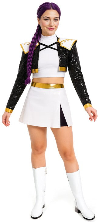 ¿Estás buscando un disfraz de "Las Guerreras K-pop" para tu fiesta? Con el disfraz de Rumi Golden para mujer tendrás el traje perfecto para disfrazarte con el vestuario que lleva la líder y vocalista principal de la banda K-pop de chicas de las Huntr/x en la famosa canción "Golden" de la película "Las Guerreras K-pop" de Netflix y triunfarás en tu fiesta de disfraces.