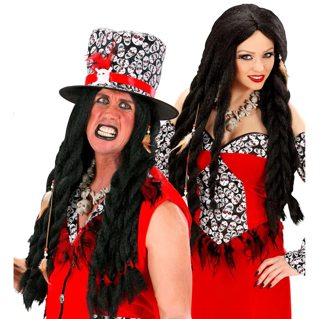 Comprend : une perruque avec de longues dreadlocks noires ornées de breloques en similicuir et de plumes. Idéale pour les déguisements vaudous.